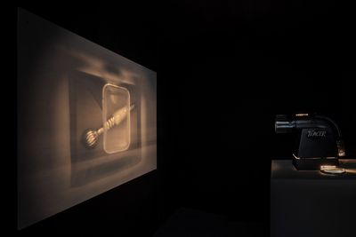 Doris Guo, all sounds flash, 2023, wood, paint, hardware, opaque projector, glass, doll, dimensions variable