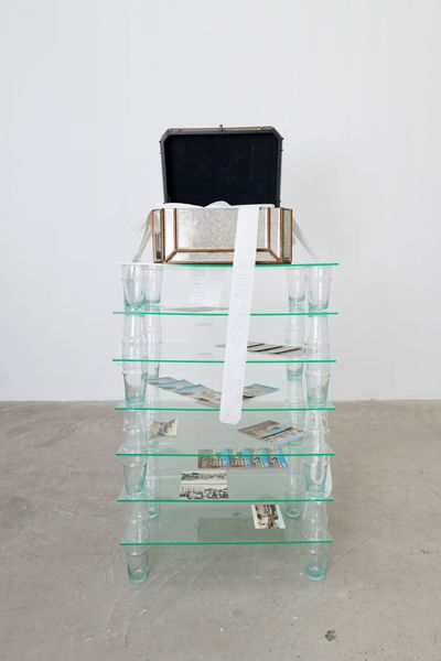 Tangerine mirror box, receipt paper, postcards, drinking glasses, wax