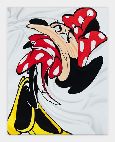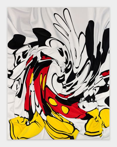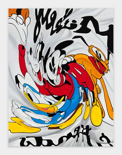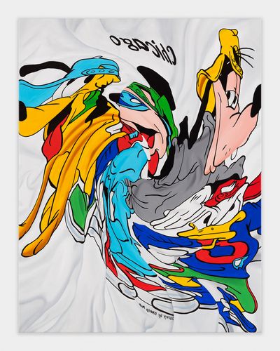 Since 2019, when she presented the sculpture “Pile” a mountain of cotton t-shirts printed as merch for rock concerts, political campaigns and other causes at Tate Modern, the artist has been working with and drawing inspiration from graphic t-shirts most recently creating hyperreal images in oil on canvas from photographs of T-shirts crumpled on the floor. Agents of commercialized popular culture and underground ephemera, cartoons and band logos are abstracted, amplifying the paintings’ existence as a commodities. In continuation of this series, which reanimates the static surface of the t-shirt, Disney’s cast of characters swirl forming a center point of enchantment, a hypotonic, added element of seduction.