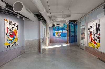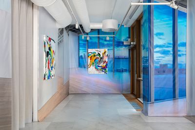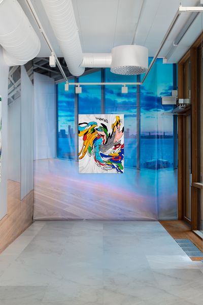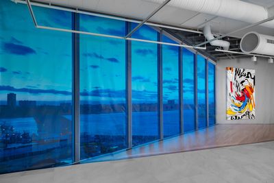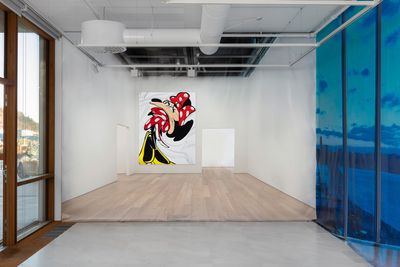 For her solo exhibition at VI, VII, Douglas presents six new paintings set against a vinyl/pvc backdrop picturing the interior of The Whitney Museum in New York.