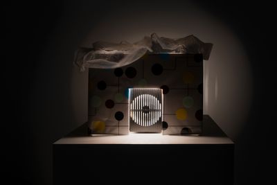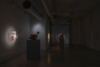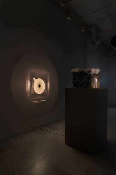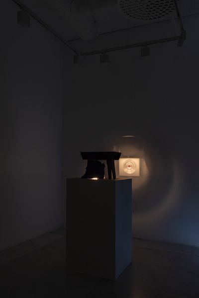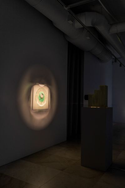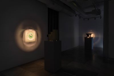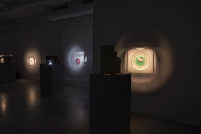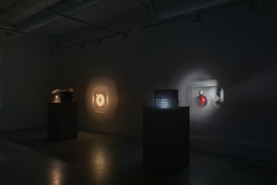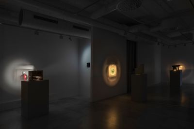Four sculptures in the room are positioned in a row. Each sculpture consists of a static image projected onto the wall and its accompanying housed machinery of different compositions that sit on pedestals. Each sculpture follows its own logic of expression, utilizing narratives of daily environments and its hauntings.