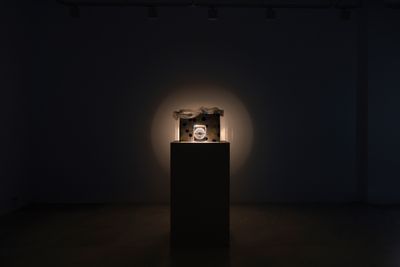 (Detail) Doris Guo, all sounds flash, 2023, wood, paint, hardware, opaque projector, glass, doll, dimensions variable
