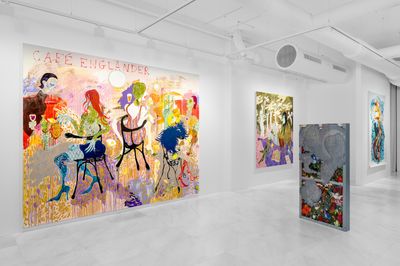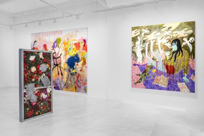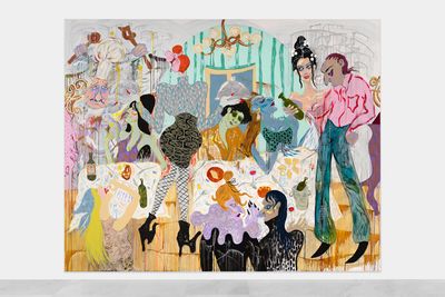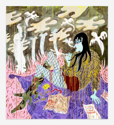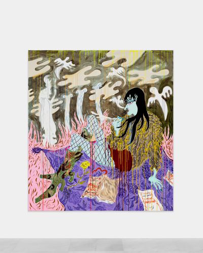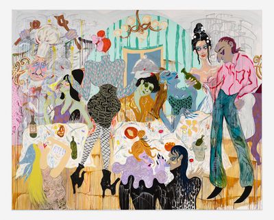 With a multi-disciplinary approach spanning sculpture, performance, textile work, costume, painting, drawing and video work with an exuberant aesthetic, Tenvik is a creator of worlds within worlds in immersive installations. Tenvik is drawn towards narratives, colour and exaggerations, while trying to understand human paradoxes. Her paintings are inspired by people, dreams and mythological fragments which interweave in a richly chromatic intricate maximalism. Her scenes show interactions that occur in cities, combining vulnerability with decadence. Born in London in 1990, the artist lives and works in Oslo.