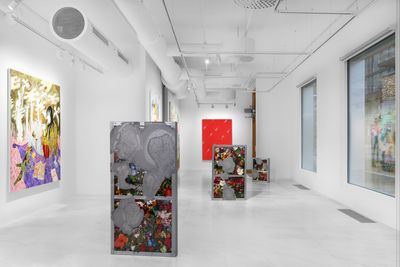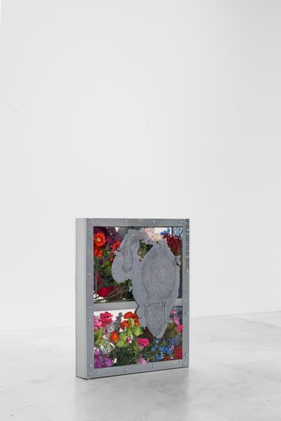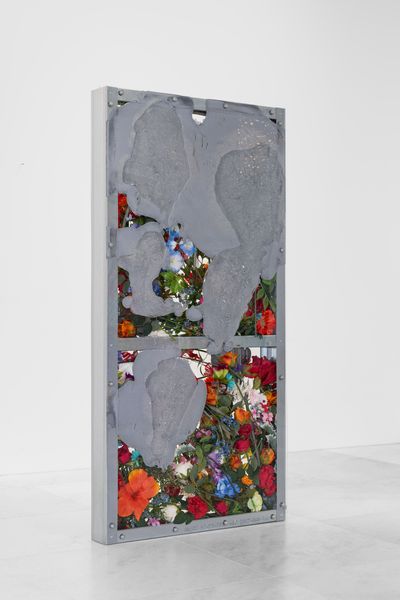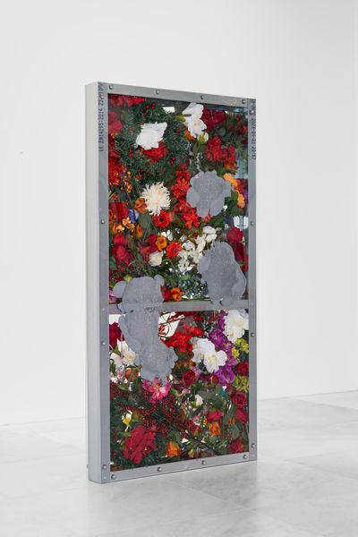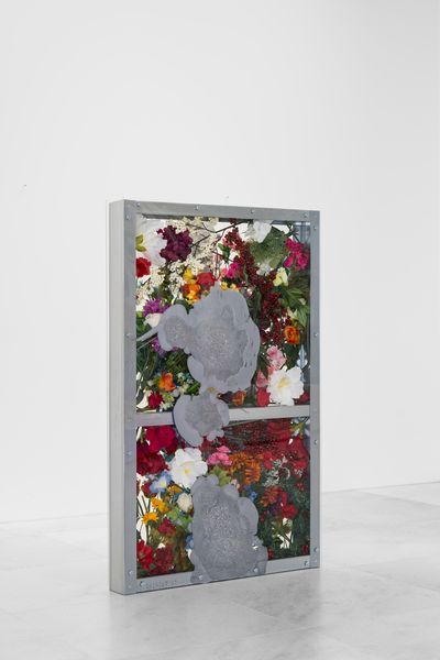 Three new sculptures by American artist, Amy Yao, made with standard building materials, including plexiglass and steel beams encase varied arrangements of artificial flowers and hand colored silver resin.