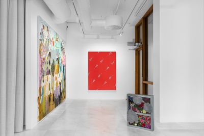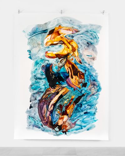 Norwegian artist Jorunn Hancke Øgstad presents a little known side of her practice: a large, and formally complex painting with fabric dye on a polypropylene sheet (Untitled, 2023). Though she has been experimenting with these works in her studio for the past three years, they remain rare, and this example is the first to be exhibited publicly. Here visitors can see the same dry pigment that she uses to produce her works on canvas, but more luminous and vibrant as it sits on the surface of the plastic sheet.