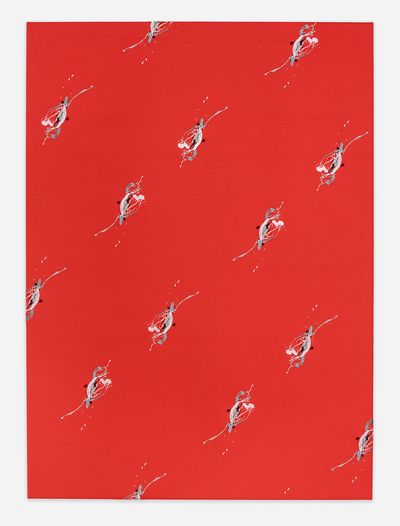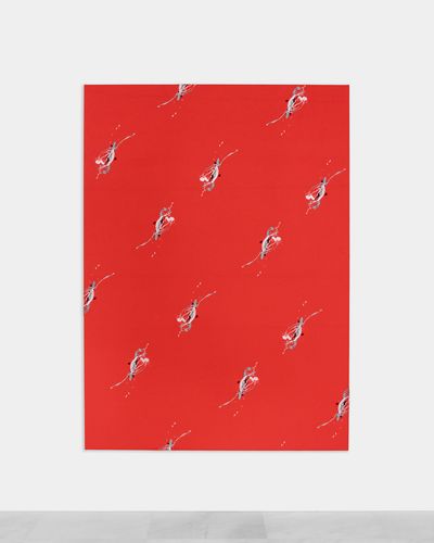Drawing further on the notion of luxury and excess, Hamburg based artist duo Jochen Schmith delves into the appropriation of painterly expressions, with one of their mixed media “paint splatter” works (Untitled, 2023). In this piece, splatter marks resembling those from drip paintings are reproduced in silk embroidery before being stitched into a soft cashmere. Here the commodification of artistic labor best exemplified by the 1990’s craze for painters pants in a “just left the studio” style, is thereby turned back into an artwork, bringing the gesture full circle.