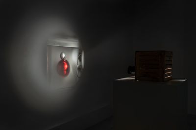 Four sculptures in the room are positioned in a row. Each sculpture consists of a static image projected onto the wall and its accompanying housed machinery of different compositions that sit on pedestals. Each sculpture follows its own logic of expression, utilizing narratives of daily environments and its hauntings.