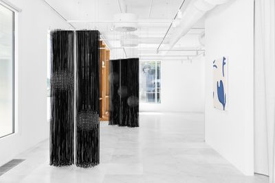 Known for colorful and large-scale, site-responsive works, LeWitt has previously explored modularity connecting works at the top to form relaxed sculptural gatherings out of individual elements. With Hanging Spheres, LeWitt debuts an entirely new body of work made from hand-cut black rubber and reflective steel beads. Suspended from the ceiling, these groupings of two (Hanging Sphere 40, 66.5, 2021) and three sculptures, (Hanging Sphere 75, 56.5 and 43, 2021) respectively produce an optical illusion when moved around. The numbered titles of these works refer to the height of the spheres in inches.